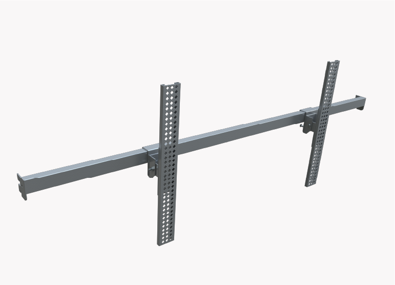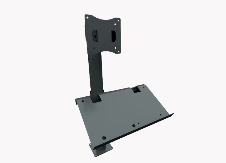 Accesorio metálico con fijación independiente apto para pantalla colgante y bandeja porta teclado.